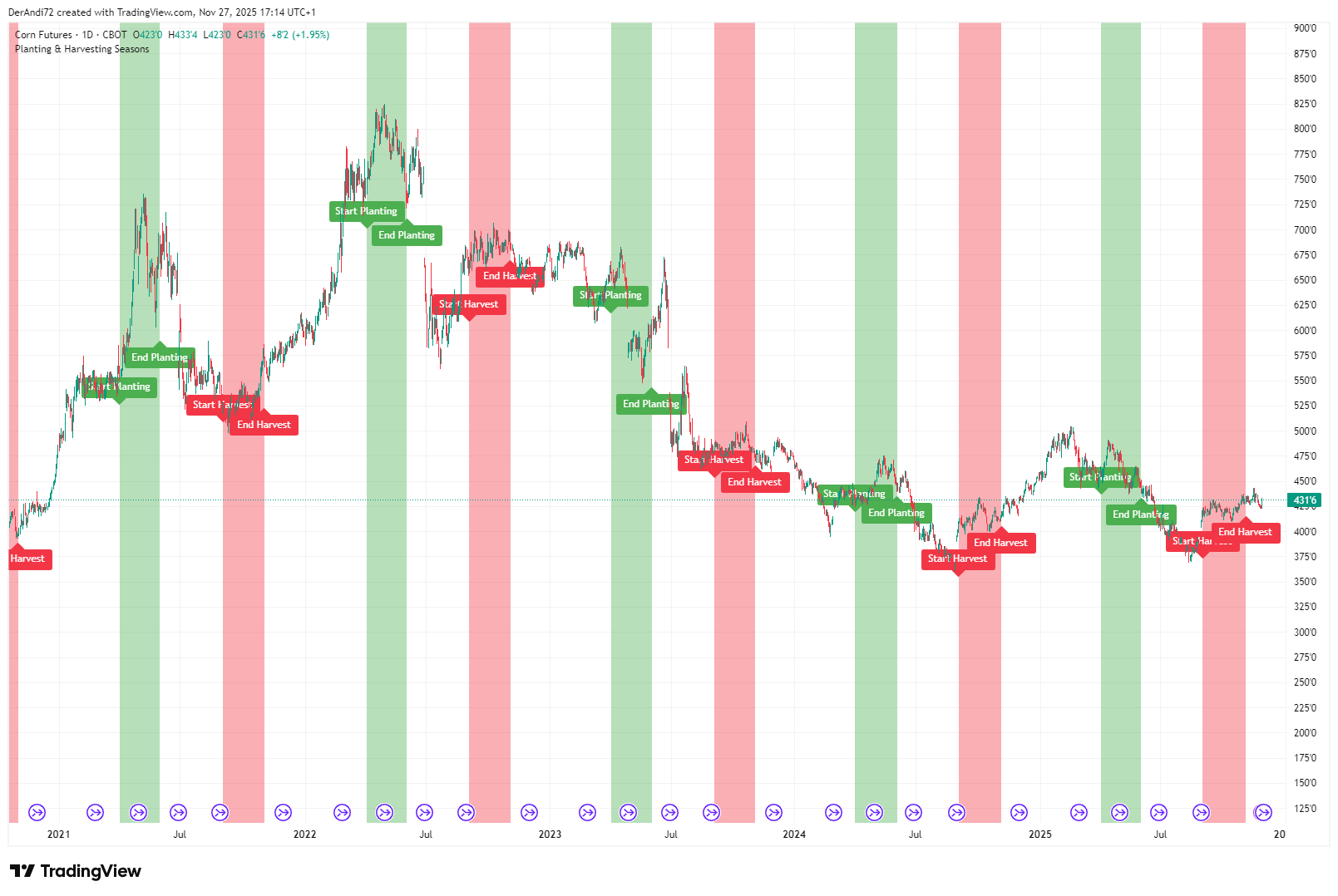 Planting and harvest cycles are not optional knowledge — they are the foundation of price behaviour in agricultural markets. With the TradingView Planting & Harvest Script, traders can visualise this hidden rhythm directly on their charts, gaining a structural edge that repeats every year.